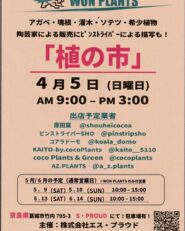 ようやく陽気な季節到来となり....4月は エス・プラウド(WON PLANTS) 主催の「植の市」が開催されます。今回は出店者のメンバー様も増え、今まで以上に楽しいひと時をお過ごしいただけるのではないかと?色々と取り揃えてお待ちしておりますので気軽にブラ~っと覗いて見て下さい。欲しかったものが見つかるかもしれません!??? お待ちしております。。。