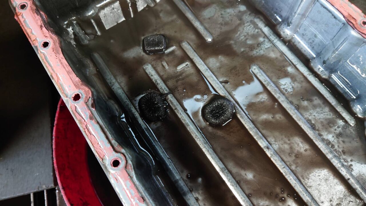 オイルパン内側は このように鉄粉が出てるのと オイルの色が黒いですね…