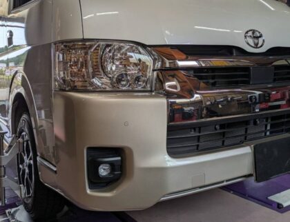 こんにちは、ヒデちゃんです。よくインスタで見る風景で行ってみたいと思っていました。その名は ¨あらぎの里¨です。タイミングよくツーリングのお誘いがあり行って来ました。すごい人でやっとのことで撮影出来ました。って話でした。 本題に入りたいと思います。今回のアライメントはトヨタ ハイエース TRH229Wでのご入庫です。それではいつものようにターゲットを装着していき測定していきます♬ フロント側から測定データを確認していくと右側のトー角が外側に基準値より外れています。ハイエースはトー角・キャンバー角・キャスター角と調整が出来ます。基準値内に入っていますが左右差を合わせて行きます。 キャンバー角・キャスター角・トー角を調整していきます♬ バッチリ基準値内に入りました♬ リア側を確認していきますが調整が出来ないです。表記もブラックアウトになっております。